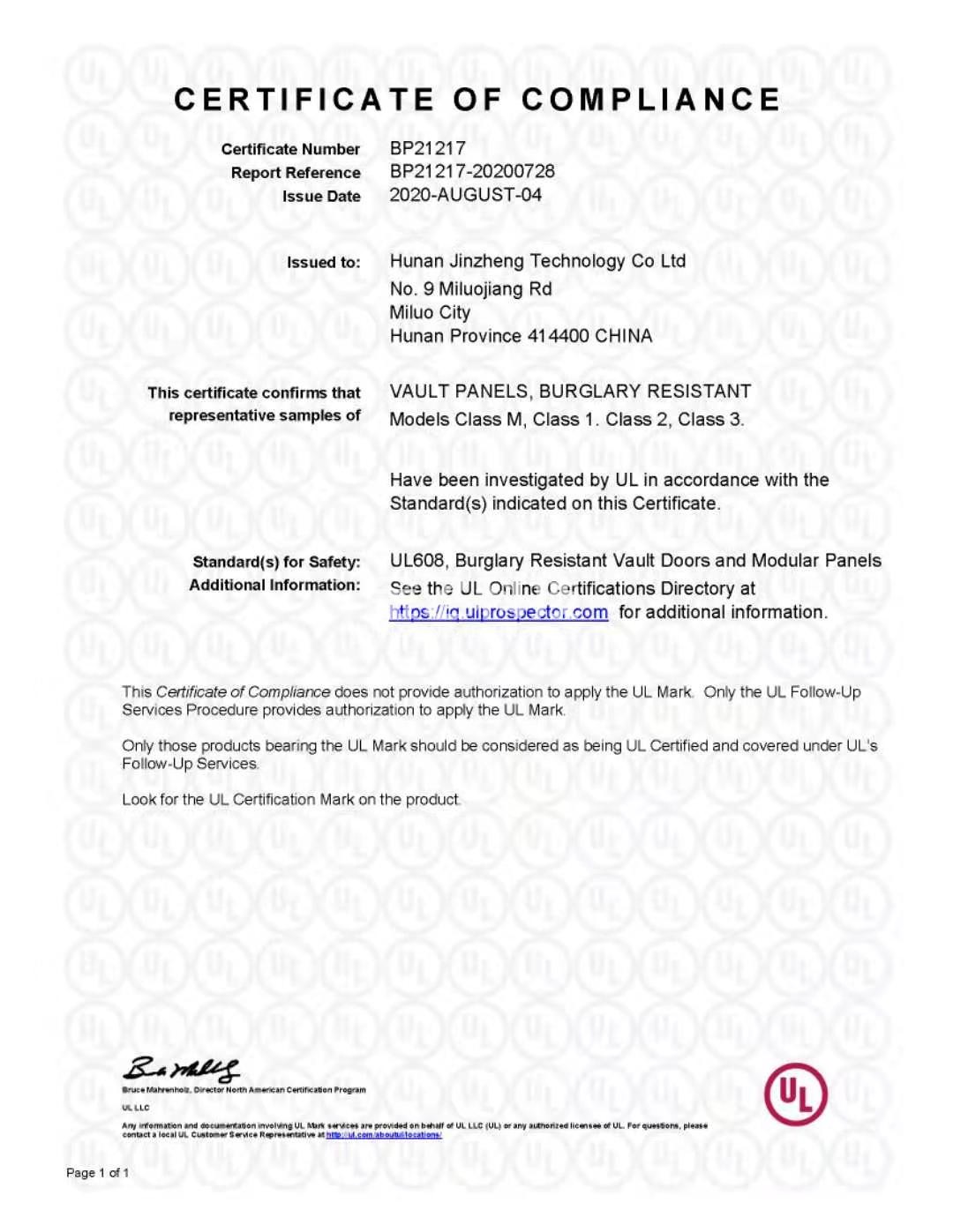 湖南麻豆网观看黄色三级片科技有限公司生產的麻豆三级美女在线观看、金庫壁板、金庫通風口三款產品成功通過美國UL-608全係列認證(M級、1級、2級、3級)